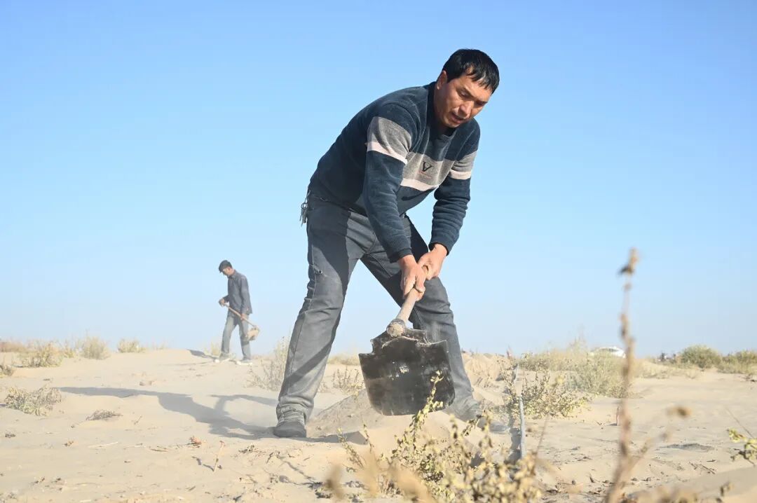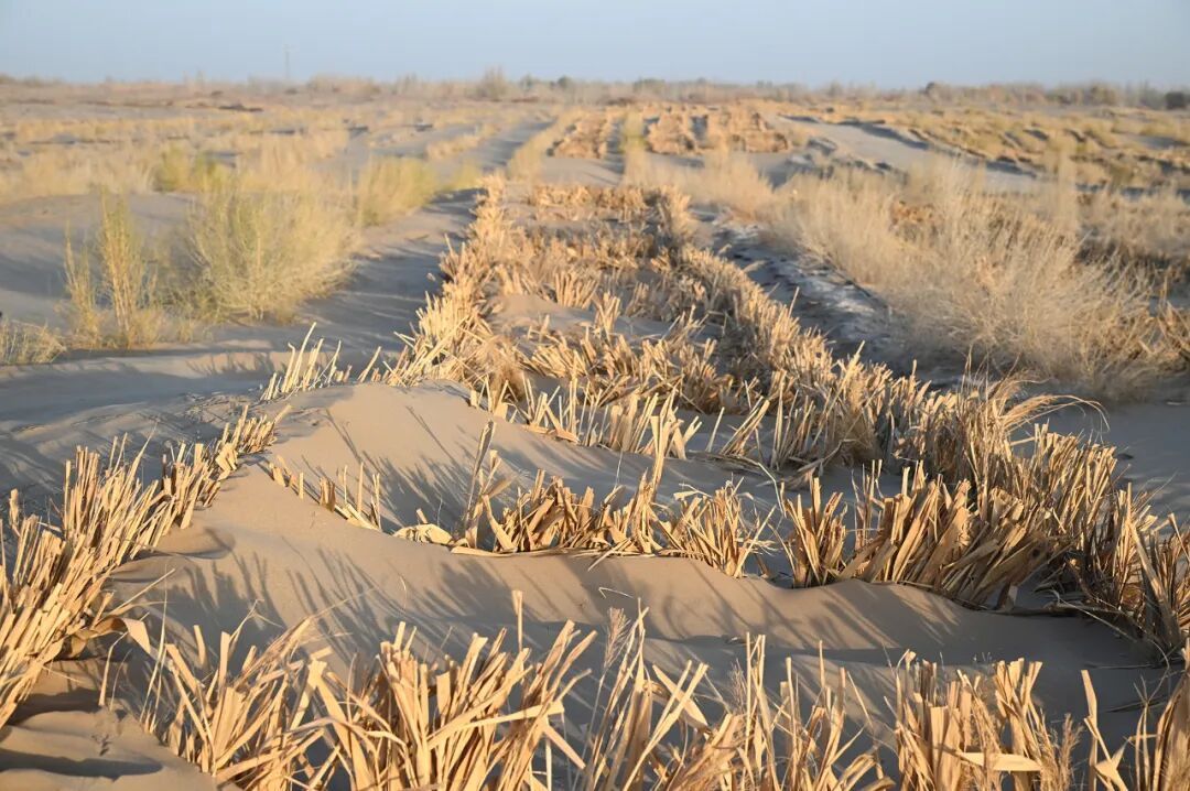 温阿勒台库什村三面被托格拉克沙漠环抱,最近的沙丘离村民住房仅30米。每年春季,沙尘暴频频来袭,流沙不断吞噬着原本肥沃的耕地。“2022年之前,村里年轻人大多外出打工。曾有100多亩棉花地因沙害每亩减产近200公斤,不少人对治沙失去了信心。”村党支部书记木沙·买买提回忆道。那时,沙化不仅是土地的威胁,更是整个村庄发展的“拦路虎”。